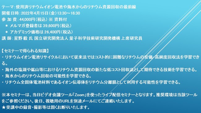 先端技術情報や市場情報を提供している(株)シーエムシー・リサーチ(千代田区神田錦町: https://cmcre.com/ )では、 各種材料・化学品などの市場動向・技術動向のセミナーや書籍発行を行っておりますが、 このたび「使用済リチウムイオン電池や海水からのリチウム資源回収の最前線」と題するセミナーを、 講師に星野 毅 氏 国立研究開発法人 量子科学技術研究開発機構 上席研究員)をお迎えし、2022年4月15日(金)13:30より、 ZOOMを利用したライブ配信で開催いたします。 受講料は、 一般:44,000円(税込)、 弊社メルマガ会員:39,600円(税込)、 アカデミック価格は26,400円(税込)となっております(資料付)。