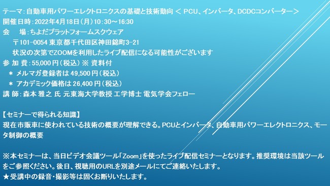 先端技術情報や市場情報を提供している(株)シーエムシー・リサーチ(千代田区神田錦町: https://cmcre.com/ )では、 各種材料・化学品などの市場動向・技術動向のセミナーや書籍発行を行っておりますが、 このたび「自動車用パワーエレクトロニクスの基礎と技術動向 < PCU、インバータ、DCDCコンバーター>」と題するセミナーを、 講師に森本 雅之 氏 元東海大学教授 工学博士 電気学会フェロー)をお迎えし、2022年4月18日(月)10:30より、 ちよだプラットフォームスクエア(東京都千代田区)にて開催いたします。 (状況の次第でZOOMを利用したライブ配信になる可能性がございます)。 受講料は、 一般:55,000 円(税込)、 弊社メルマガ会員:49,500 円(税込)、 アカデミック価格は26,400 円(税込)となっております(資料付)。