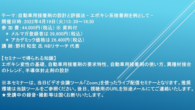 先端技術情報や市場情報を提供している(株)シーエムシー・リサーチ(千代田区神田錦町: https://cmcre.com/ )では、 各種材料・化学品などの市場動向・技術動向のセミナーや書籍発行を行っておりますが、 このたび「自動車用接着剤の設計と評価法 - エポキシ系接着剤を例として -」と題するセミナーを、 講師に野村 和宏 氏 NBリサーチ 代表)をお迎えし、2022年4月19日(火)13:30より、 ZOOMを利用したライブ配信で開催いたします。 受講料は、 一般:44,000円(税込)、 弊社メルマガ会員:39,600円(税込)、 アカデミック価格は26,400円(税込)となっております(資料付)。