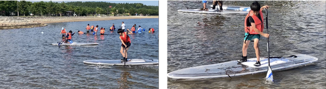 1日目の最後は、透明なSUP(スタンドアップパドル)とカヤックに乗り、海の上からアマモ場を観察しました。海と森ふれあい体験館のスタッフに漕ぎ方を教わった子どもたちは、これまでの学びを踏まえて陸奥湾の中へ。自分の目で海の底に生えるアマモを見て、アマモをより身近に感じていました。