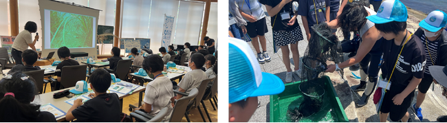 その後、会場付近の海に移動し、実際に、アマモ場(アマモの生息場所)に生息する生き物の観察を行いました。アマモ場付近に予め仕掛けた漁網を揚げてみると、中からはカニやエビ、貝のほか、ウグイやハゼ、カレイの稚魚なども網にかかっていて、子どもたちは大喜び。アマモ場の付近には多くの海の生き物が生息していることを体感していました。