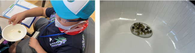 志田さんから、陸奥湾ではこの30年で約4,800ヘクタールのアマモ場が無くなっている現状と共に、種子によって繁殖するアマモは、海底に注射器で種子をまくと、どんどん繁殖していき、アマモ場の復活につながっていくことを学んだ子どもたち。その後手渡されたのは″アマモの種”。実際に触ってみたり、においを嗅いだりして、種子がどのような物かを確かめていました。においを嗅いだ子どもたちからは「臭い!」「生ごみのにおいがする」などといった回答がたくさん上がりました。実はアマモの種子には硫黄の成分が含まれていて、悪臭を放っているのだそうです。アマモの知られざる一面を知った子どもたちでした。