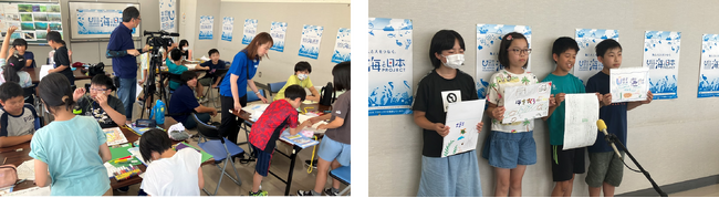 イベントの集大成は、これまでの学びの総まとめ。これまでに学んだことを1枚の絵に表したほか、4つの班に分かれて学習の成果を発表しました。子どもたちが発表した成果物は、今後大湊海軍コロッケの商品パッケージになるなど、多くの人に今回の学びを発信することになります。