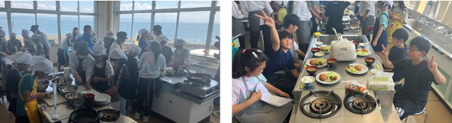 海の恵みに触れた子どもたちは、その海の幸を使った料理に挑戦しました。作るのは下北名物「大湊海軍コロッケ」。牛脂で揚げたコロッケの中にホタテを取り入れたスペシャルメニューです。調理指導に青森山田高校調理科の梅田 弥昇彦先生と生徒4人に協力していただき、美味しいランチを完成させました。子どもたちは海の恵みに感謝しながら、手作りのコロッケの味を堪能していました。