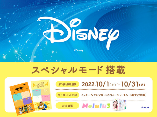 フリュー株式会社(本社:東京都渋谷区、代表取締役社長:三嶋隆、以下フリュー)は、人気プリントシール(以下、プリ)機『Melulu(メルル)3』に明日10月1日(土)より、「ディズニースペシャルモード」第3弾を期間限定で搭載いたします。