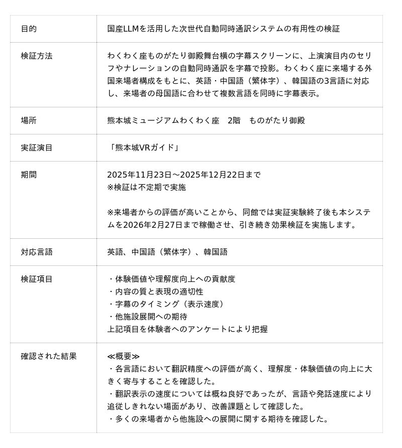 TOPPANホールディングスのグループ会社であるTOPPAN株式会社(本社:東京都文京区、代表取締役社長:大矢 諭、以下 TOPPAN)は、大規模言語モデル(Large Language Model、以下 LLM)を活用した次世代自動同時通訳システムの実証実験を、「熊本城ミュージアムわくわく座」(※1)(所在地:熊本市中央区、以下 わくわく座)で2025年11月23日(日)から2025年12月22日(月)まで実施しました。