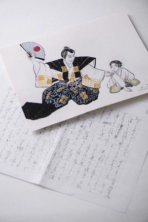 ▲役者絵と雑誌『本の窓』原稿。ここ数年のコロナ禍では絵を描き、日々を綴った。