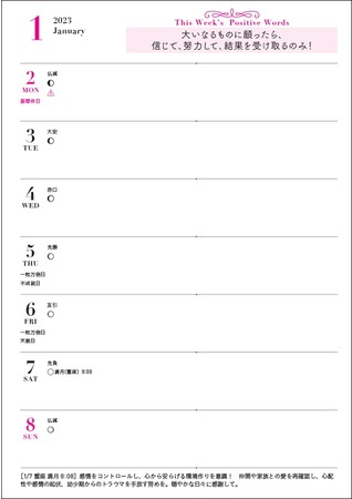 「週間スケジュール」の上には、週替わりのポジティブ言葉を掲載。
