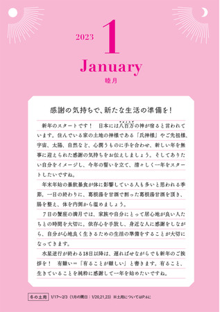 「月の始まり」には、季節や天体の動きに合わせた、その月に意識したいことや、ラッキーアクションなどのメッセージを記載。