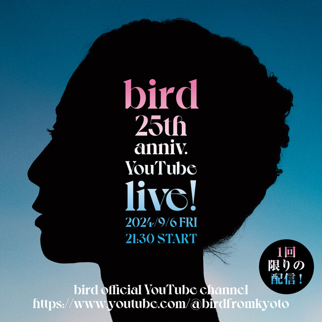 birdは1999年7月23日発売のデビュー・アルバム『bird』から25年となる2024年7月23日、デビューアルバム25周年を記念してオフィシャルYouTubeチャンネルを開設。積極的に過去のMVなどをコンスタントに公開して、コンテンツも充実しているなか、birdオフィシャルYouTubeチャンネルならではの新しい企画として『bird "25th Anniv." YouTube live!』と題して、2024年9月6日(金) 21:30に自身のチャンネルでプレミア公開されることをbird公式SNS等で8/23(金)に発表。音楽ファンにはたまらない、ベスト盤前の予習にもなるスペシャル・コンテンツがアーカイブなし、たった1回限りで配信される。