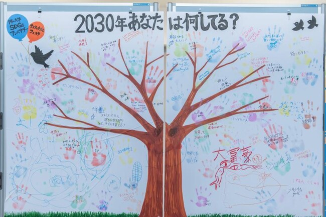 また、本部棟1階に出店者・来場者参加型の手形アートを設置しました。「2030年あなたは何してる?」というテーマで、自分の手形とメッセージを思い思いに残していき、カラフルな大きな木のアートが完成しました。