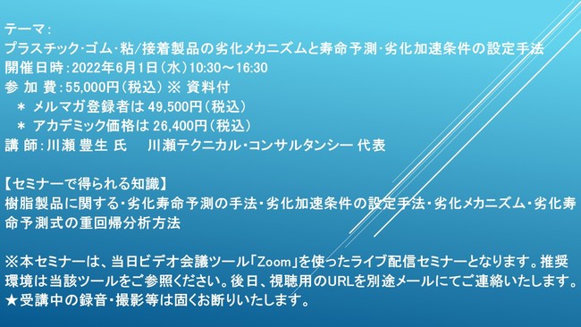 先端技術情報や市場情報を提供している(株)シーエムシー・リサーチ(千代田区神田錦町: https://cmcre.com/ )では、 各種材料・化学品などの市場動向・技術動向のセミナーや書籍発行を行っておりますが、 このたび「プラスチック・ゴム・粘/接着製品の劣化メカニズムと寿命予測・劣化加速条件の設定手法」と題するセミナーを、 講師に川瀬 豊生 氏 川瀬テクニカル・コンサルタンシー 代表)をお迎えし、2022年6月1日(水)10:30より、 ZOOMを利用したライブ配信で開催いたします。 受講料は、 一般:55,000円(税込)、 弊社メルマガ会員:49,500円(税込)、 アカデミック価格は26,400円(税込)となっております(資料付)。