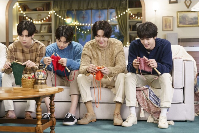 ソファに並んで座り、楽しそうに編み物をしている7人。中央に座っているVがとなりの様子がおかしいことに感づき横を見ると、J-HOPEとJIMINが何故か毛糸に絡まってしまっていました。なんとか毛糸をほどこうと、お互いが強引に毛糸を引っ張りあう2人の姿を見て、少し呆れ気味のJUNG KOOK、SUGA、そしてJIN。さらに、RMが2人を助けようとしますが、自身も巻き込まれて毛糸に絡まってしまい、やってしまったという表情を浮かべます。