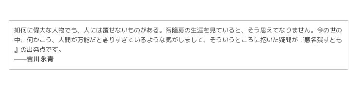 株式会社KADOKAWAより、歴史小説界で活躍中の吉川永青(よしかわ・ながはる)さんの最新作『悪名残すとも』を、2015年12月25日に発売いたします。戦国の世、その美貌から幼少期には大内義隆に可愛がられ、その後彼の重臣となり、一万の軍を率いた若き軍師 陶隆房(すえ・たかふさ)に焦点を当てた長篇です。