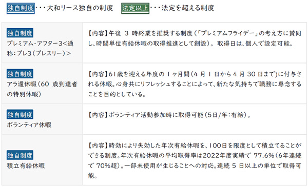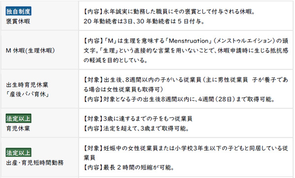 性別や年齢を問わず、誰もが十分に能力を発揮しながら働き、充実した人生を送ることができるよう「ワーク」と「ライフ」、働き方(勤怠管理)と休み方(休暇)の双方による両立支援制度を整備しています。