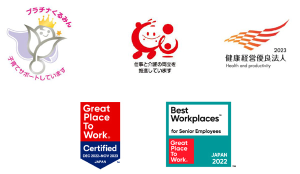 2009年、2011年、2014年、2019年に厚生労働省の次世代マーク「くるみん」、2020年に「プラチナくるみん」の認定を取得。経済産業省と日本健康会議による「健康経営優良法人」では2018年、2022年、2023年に大規模法人部門で選定を受けています。