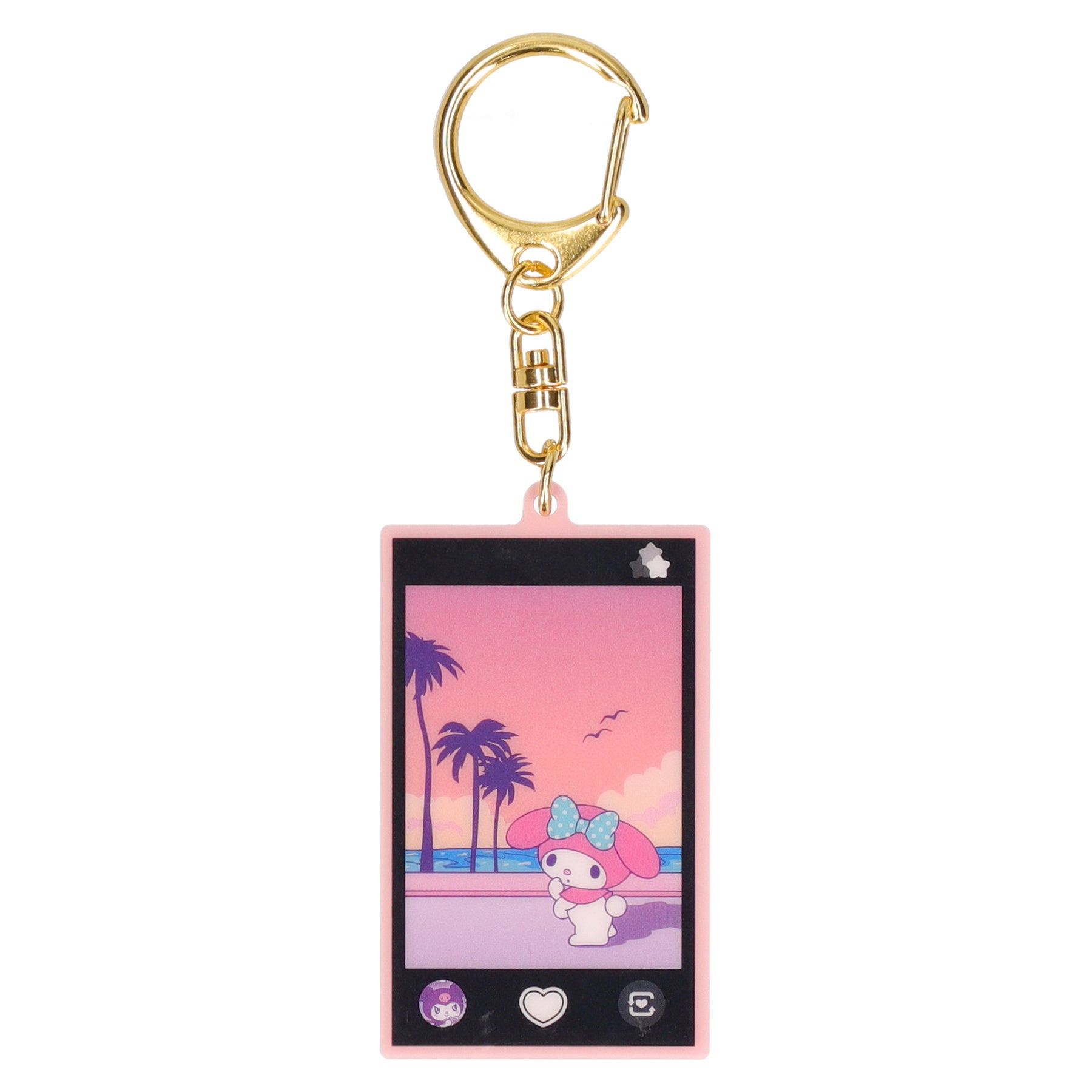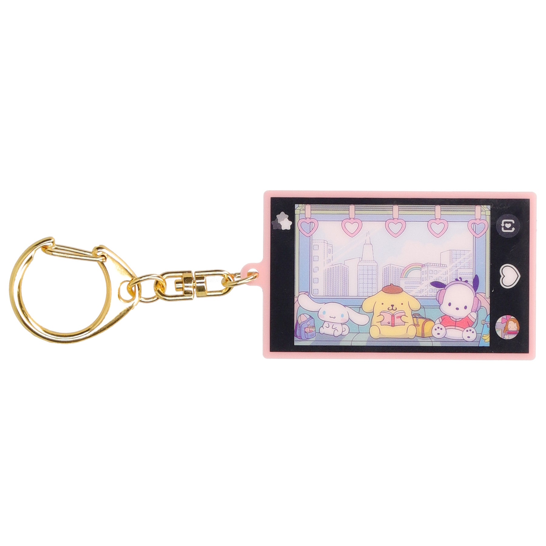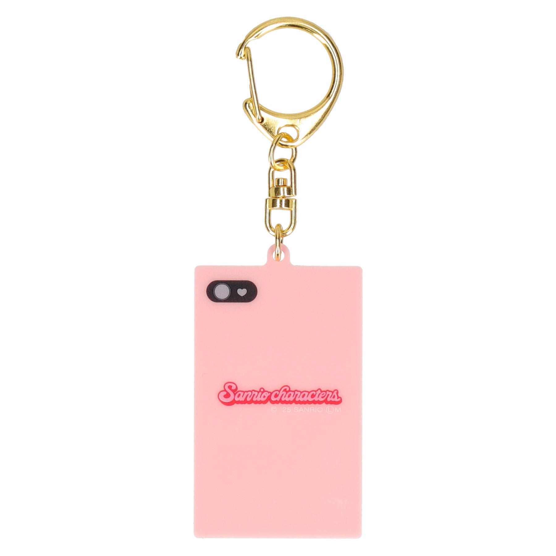 スマートフォンでサンリオキャラクターたちを不意打ちに撮影する瞬間を切り取ったデザインで、それぞれキャラクターたちの日常が楽しめるキーホルダーが登場します。シャッターボタンはハートのデザイン、サムネイルには一つ前に撮影したさまざまなキャラクターの写真がいます。背面はベビーピンクのスマートフォンケースで、細部までこだわったデザインです。