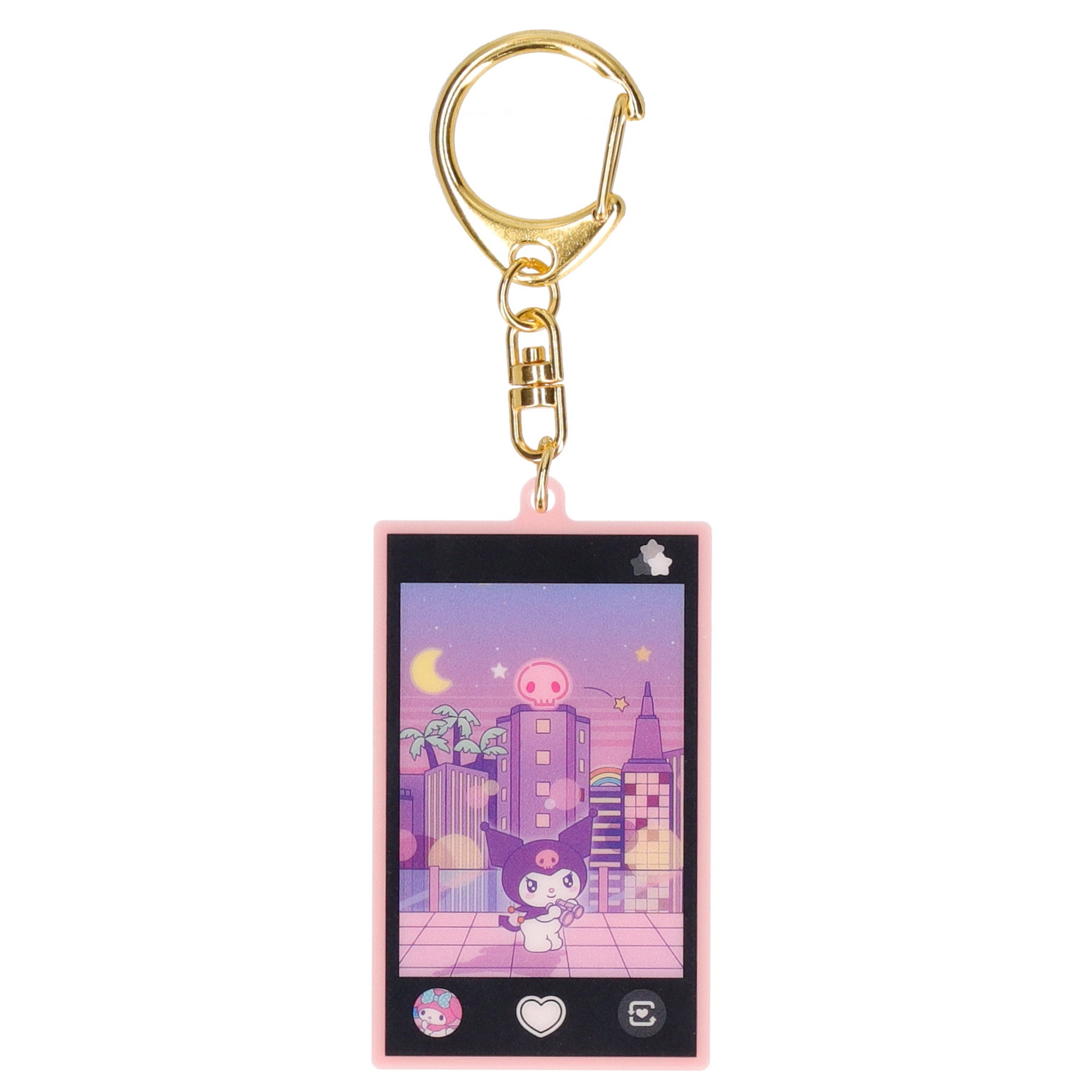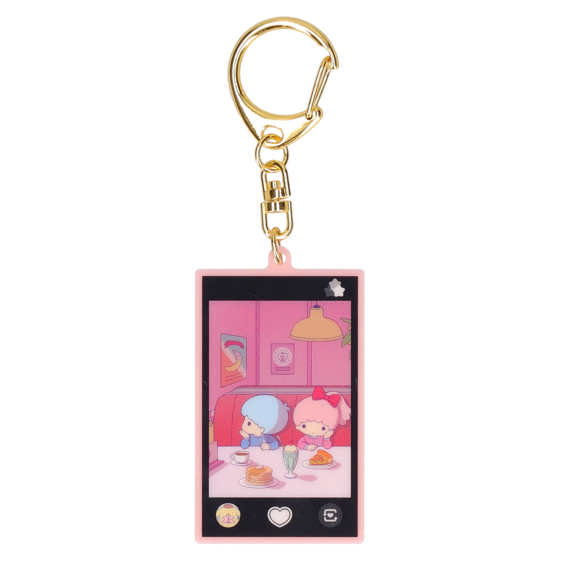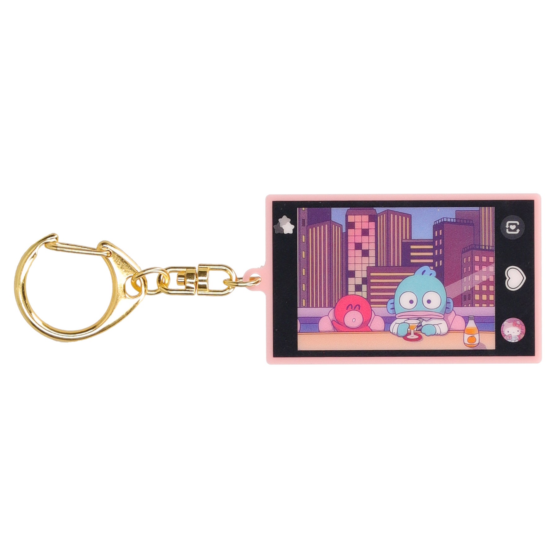 スマートフォンでサンリオキャラクターたちを不意打ちに撮影する瞬間を切り取ったデザインで、それぞれキャラクターたちの日常が楽しめるキーホルダーが登場します。シャッターボタンはハートのデザイン、サムネイルには一つ前に撮影したさまざまなキャラクターの写真がいます。背面はベビーピンクのスマートフォンケースで、細部までこだわったデザインです。