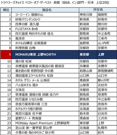 「2023 トラベラーズチョイス ベスト・オブ・ザ・ベスト ホテル」『MIMARU東京 上野NORTH』 旅館(B&B、イン)部門 日本9位に選出(ニュースリリース)