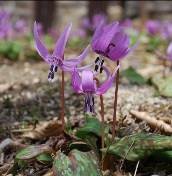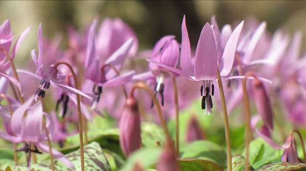 北海道〜九州の山林原野に広く群生し、晴天時のみ開花する多年草です。6枚の花被片を大きくそりかえし、うつむきかげんに咲くやさしい春の花です。高さ10〜20cmの花茎に1輪の花を咲かせますが、種から開花するまでは7、8年ほど要します。昔は片栗粉の原料として用いられ、この根茎より製した質の良い澱粉が使用されていましたが、現在は、ジャガイモの澱粉が代用されています。園内では約5,000株が随時開花し、4月中旬まで見ごろとなる見込みです。