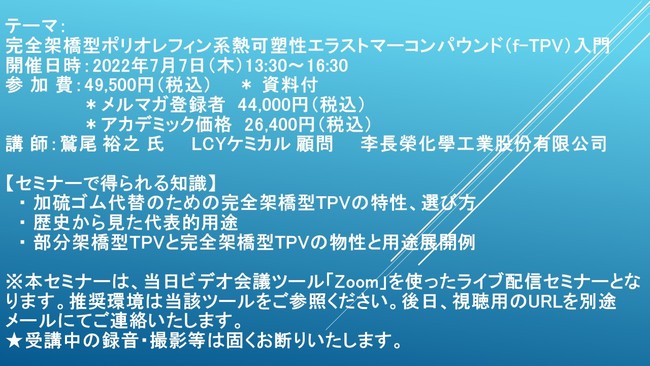 先端技術情報や市場情報を提供している(株)シーエムシー・リサーチ(千代田区神田錦町: https://cmcre.com/ )では、 各種材料・化学品などの市場動向・技術動向のセミナーや書籍発行を行っておりますが、 このたび「完全架橋型ポリオレフィン系熱可塑性エラストマーコンパウンド(f-TPV)入門」と題するセミナーを、 講師に鷲尾 裕之 氏 LCYケミカル 顧問 李長榮化學工業股份有限公司)をお迎えし、2022年7月7日(木)13:30より、 ZOOMを利用したライブ配信で開催いたします。 受講料は、 一般:49,500円(税込)、 弊社メルマガ会員:44,000円(税込)、 アカデミック価格は26,400円(税込)となっております(資料付)。