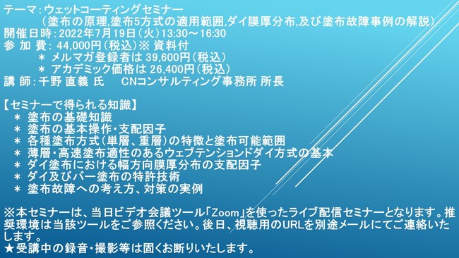 先端技術情報や市場情報を提供している(株)シーエムシー・リサーチ(千代田区神田錦町: https://cmcre.com/ )では、 各種材料・化学品などの市場動向・技術動向のセミナーや書籍発行を行っておりますが、 このたび「ウェットコーティングセミナー (塗布の原理,塗布5方式の適用範囲,ダイ膜厚分布,及び塗布故障事例の解説)」と題するセミナーを、 講師に千野 直義 氏 CNコンサルティング事務所 所長)をお迎えし、2022年7月19日(火)13:30より、 ZOOMを利用したライブ配信で開催いたします。 受講料は、 一般:44,000円(税込)、 弊社メルマガ会員:39,600円(税込)、 アカデミック価格は26,400円(税込)となっております(資料付)。