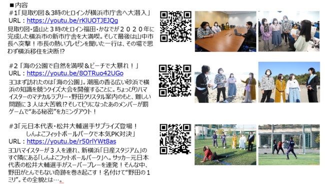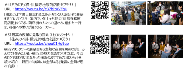 動画は全5本で、横浜市役所での山中竹春 横浜市長へのインタビューや、しんよこフットボールパークでのサッカー元日本代表・松井大輔選手とのPK対決、下町人情あふれる商店街での買い物などなど、見どころが満載の内容となっております。