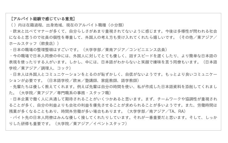 日本人と一緒に働き、日本社会のマナーや組織風土に触れ、共感できるところとそうではないところに気づくことはアルバイトだからこそ得られる貴重な経験です。日本語母語話者ではない留学生を職場に迎えることは育成方法や研修の準備、勇気や覚悟も必要かもしれませんが、スタッフも会社・店舗も一緒に成長できるチャンスです。ぜひ調査レポートもご参照ください。
