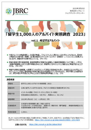 株式会社リクルート(本社:東京都千代田区、代表取締役社長:北村 吉弘)の調査研究機関『ジョブズリサーチセンター(JBRC)』(https://jbrc.recruit.co.jp/)は、「留学生1,000人のアルバイト実態調査2023」を2023年1月に実施、その結果の一部をご報告致します。