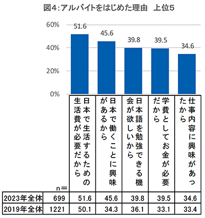 アルバイトをしている留学生699人にはじめた理由を複数回答で聞くと、「生活費」51.6%がもっとも多く、次いで「日本で働くことに興味があるから」45.6%、「日本語を勉強できる機会が欲しいから」39.8%と続きました。参考で2019年と比較すると、「日本で働くことへの興味」が10pt近く増えています。2020年以降、コロナ禍の影響で予定通り来日できない等困難な状況を経験した留学生もいるでしょう。そのような中でも来日した留学生は「日本で働くこと」への興味や関心が強いのかもしれません。