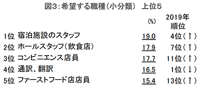 希望する仕事内容を複数回答で聞くと、「宿泊施設のスタッフ」19.0%、「ホールスタッフ(飲食店)」17.9%等が上位にあがりました。上位5つをみると、「通訳、翻訳」以外は2019年よりも上位にあがっています。接客サービスを伴う仕事が希望されているようです。