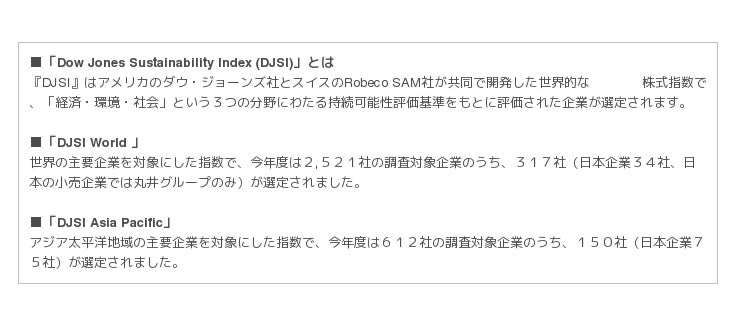 株式会社丸井グループ(本社:東京都中野区、代表取締役社長:青井 浩)は、この度、世界的な社会的責任投資(SRI) ※1 株式指数である「Dow Jones Sustainability World Index(DJSI World)」の構成銘柄に初めて選定、あわせてアジアパシフィック地域にて構成される「Dow Jones Sustainability Asia Pacific Index(DJSI Asia Pacific)」の構成銘柄に2年連続で選定されました。