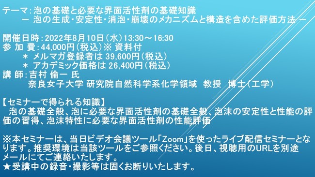 先端技術情報や市場情報を提供している(株)シーエムシー・リサーチ(千代田区神田錦町: https://cmcre.com/ )では、 各種材料・化学品などの市場動向・技術動向のセミナーや書籍発行を行っておりますが、 このたび「泡の基礎と必要な界面活性剤の基礎知識」と題するセミナーを、 講師に吉村 倫一 氏 奈良女子大学 研究院自然科学系化学領域 教授 博士(工学))をお迎えし、2022年8月10日(水)13:30より、 ZOOMを利用したライブ配信で開催いたします。 受講料は、 一般:44,000円(税込)、 弊社メルマガ会員:39,600円(税込)、 アカデミック価格は26,400円(税込)となっております(資料付)。