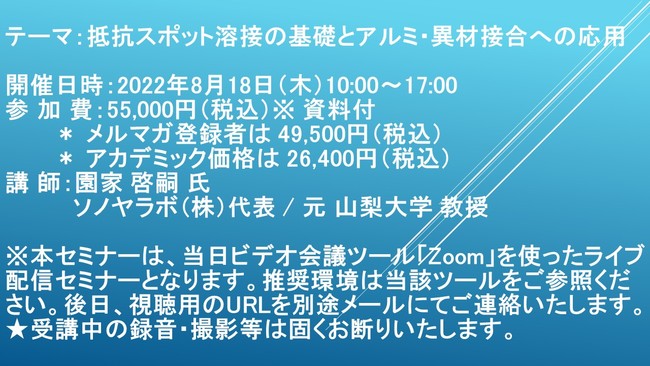 先端技術情報や市場情報を提供している(株)シーエムシー・リサーチ(千代田区神田錦町: https://cmcre.com/ )では、 各種材料・化学品などの市場動向・技術動向のセミナーや書籍発行を行っておりますが、 このたび「抵抗スポット溶接の基礎とアルミ・異材接合への応用」と題するセミナーを、 講師に園家 啓嗣 氏 ソノヤラボ(株) 代表 / 元 山梨大学 教授)をお迎えし、2022年8月18日(木)10:00より、 ZOOMを利用したライブ配信で開催いたします。 受講料は、 一般:55,000円(税込)、 弊社メルマガ会員:49,500円(税込)、 アカデミック価格は26,400円(税込)となっております(資料付)。