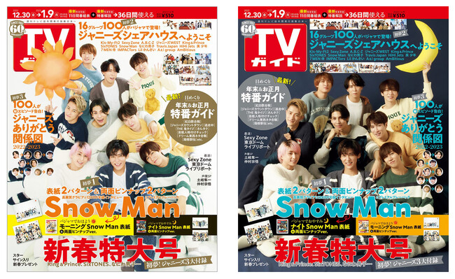 ジャニーズ16グループ総勢100名が登場するなど、豪華スターによる、年末&新春のテレビ、エンタメ情報が満載の「TVガイド新春特大号」が本日12月27日(火)に発売。モコモコパジャマ姿のSnow Manが、新春特大号の表紙を初めて飾る。また、Snow Manの新春特大号初表紙を記念し、2パターンの表紙&両面刷り分けピンナップを展開。【初夢!パジャマでおはよう モーニング Snow Man ver.】、【初夢!パジャマでおやすみ ナイト Snow Man ver.】ともに、まさに永久保存版の仕上がりとなっている。