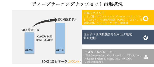 SDKI Inc.が「ディープラーニング(深層学習)チップセット市場ー世界の予測2022ー2031年」の新調査レポートを2022年02月22日に発刊しました。レポートは、業界の新ビジネスチャンスとともに、市場とその成長見通しの完全な評価を提供します。さらに、2022ー2031年の予測期間中の市場規模と年間成長率が含まれています。