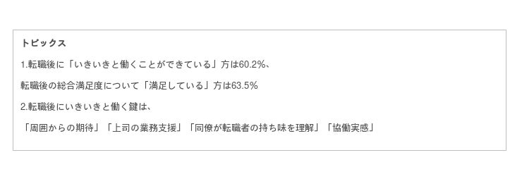 「円滑な労働移動」の推進には、転職時のベストマッチング(スキルや条件、働き方)と同様に、入社後の職場単位のミスマッチの解消が欠かせません。いくら面接時に人事や役員と条件をすり合わせても、入社後の本領発揮は、職場との適応と共進が左右するからです。今回、転職者の転職後の声から、その実態と入社後の才能開花へのヒントを探りました。注目したいのは、転職後に「いきいきを実感」している層の多くが、入社後の職場で、“新たな仲間”として丁寧に迎え入れられていると実感していることです。分析からは、以下の4つの「働きかけ」がわかりました。「周囲から期待されている」「上司は適切な業務支援をしてくれる」「職場の同僚が“自分の持ち味”を理解してくれている」「周囲と協働できている実感がある」、、、。いずれも、新たな仲間への関心と働きかけが、転職者の入社後活躍の鍵であることがわかります。会社単位の「働き方改革」から、職場単位の「働きかけ改革」へ。スキルを“採”って“用”いる“採用”企業と、新たな“才”能を職場の“要”に迎える“才要”企業。両社の人材求心力の差は、ますます広がると思います。