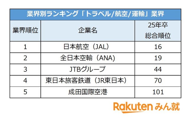 業界別にみると、トラベル/航空/運輸業界でインターンシップに参加したい企業の1位から3位は、日本航空(JAL)(総合順位:昨年54位→16位)、全日本空輸(ANA)(総合順位:昨年42位→19位)、JTBグループ(総合順位:昨年60位→44位)となりました。またサービス業界では、オリエンタルランド(総合順位:昨年34位→29位)、SBC メディカルグループ(総合順位:昨年59位→42位)、アイ・ケイ・ケイホールディングス(総合順位:昨年117位→48位)となり、トラベル/航空/運輸業界とサービス業界の人気が伸長していることがわかりました。また、2019年7月に発表をした「楽天みん就 2021年卒 インターンシップ人気企業ランキング」( https://www.nikki.ne.jp/event/20190726/ )では、全日本空輸(ANA)が総合順位:2位、日本航空(JAL)が総合順位:3位、オリエンタルランドが総合順位:13位だったことから、新型コロナウイルス感染症の5類感染症への移行と出入国時における水際措置の緩和により、学生からのトラベル/航空/運輸業界とサービス業界に対する人気がコロナ禍前に戻りつつあることがうかがえます。