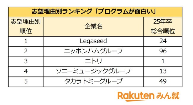 志望理由別ランキングにおける「プログラムが面白い」の項目では、トップ5のうち1位から4位までのLegaseed(総合順位:昨年37位→24位)、ニッポンハムグループ(総合順位:昨年230位→96位)、ニトリ(総合順位:昨年1位→1位)、ソニーミュージックグループ(総合順位:昨年15位→13位)が、昨年と比較してランクアップもしくはランクを維持しており、インターンシップのプログラムの面白さが学生からの人気につながることがうかがえます。