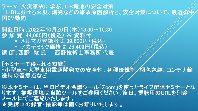 先端技術情報や市場情報を提供している(株)シーエムシー・リサーチ(千代田区神田錦町: https://cmcre.com/ )では、 各種材料・化学品などの市場動向・技術動向のセミナーや書籍発行を行っておりますが、 このたび「火災事故に学ぶ、LiB電池の安全対策」と題するセミナーを、 講師に西野 敦 氏 西野技術士事務所 代表)をお迎えし、2022年10月20日(木)13:30より、 ZOOMを利用したライブ配信で開催いたします。 受講料は、 一般:44,000円(税込)、 弊社メルマガ会員:39,600円(税込)、 アカデミック価格は26,400円(税込)となっております(資料付)。