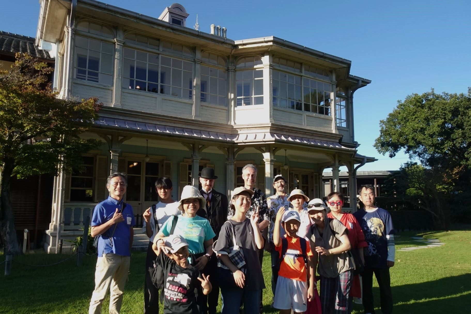 国の重要文化財に指定されている「六華苑」でガイドのクリス氏を囲み集合写真