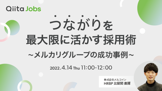 株式会社エイチームのグループ会社であるQiita株式会社(本社:名古屋市中村区、代表取締役社長:柴田健介)は、無料オンラインセミナー「つながりを最大限に活かす採用術 〜メルカリグループの成功事例〜」を2022年4月14日(木)に開催します。