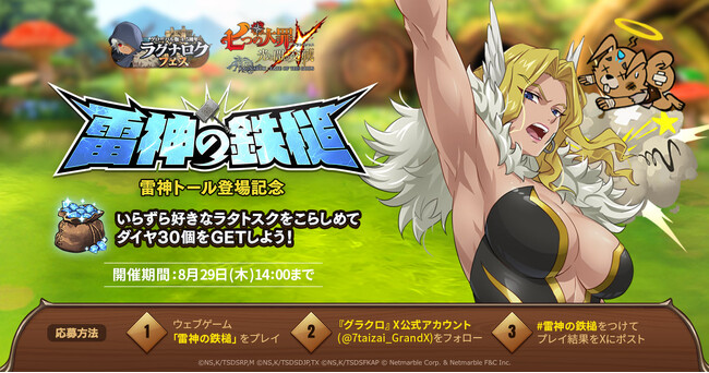 『ラグナロク』フェス開催を記念して、WEBゲーム「雷神の鉄槌」を公開いたしました。また、ハッシュタグ「#雷神の鉄槌」を付けてプレイ結果をXに投稿すると、抽選でダイヤをプレゼントするキャンペーンも開催いたします。