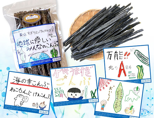 『利尻屋みのや』の「湯どうふ昆布」は、早く煮える柔らかい昆布で、出汁をとった後にそのまま食べられ、北海道土産としても人気があります。リピーターも多く、同店では一番の売れ筋商品。湯どうふと一緒に食べたり、みそ汁の具やサラダ、おでんやお鍋にも使いやすい昆布です。子どもたちは、多くの人にも海の未来を考えるきっかけにしてもらうため、今回この「湯どうふ昆布」パッケージのオリジナルラベルをデザインしました。