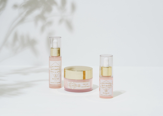 (左)<インティメール>リリーフオイル 8,800円(50mL)、(中)<インティメール>STMクリーム 6,600円(100g)、(右)<インティメール>バーシングオイル 11,000円(30mL)