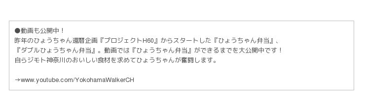 株式会社KADOKAWA(本社:東京都千代田区、代表取締役社長:松原眞樹)の月刊誌「横浜ウォーカー」がプロデュース役として株式会社崎陽軒(本社:横浜市西区、取締役社長:野並直文)と横浜マリノス株式会社(本社:横浜市港北、代表取締役社長:長谷川亨)と共同開発した『ダブルひょうちゃん弁当』が復活。『2016年2月27日開幕戦 ダブルひょうちゃん弁当』(税込980円)として、ベガルタ仙台との開幕戦が行われる2016年2月27日(土)に日産スタジアム崎陽軒催事店舗にて限定発売されることが決定しました。