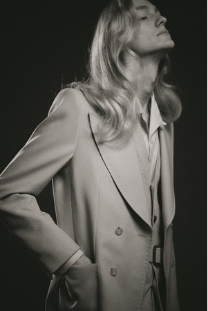 〈ボッテガ・ヴェネタ〉コート 363,000円 パンツ 121,000円 ※セーター、ブーツは参考商品