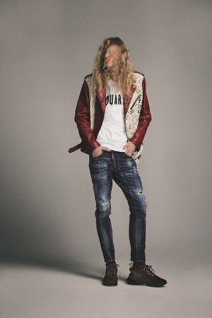 〈ディースクエアード〉レザージャケット 738,100円[WEB] Tシャツ 31,900円[WEB] デニムパンツ 86,900円 ※シューズは参考商品