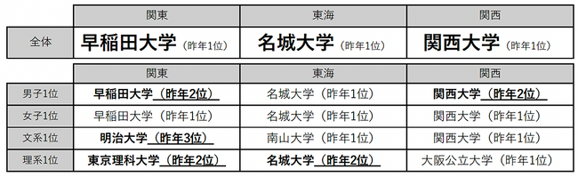 高校生の「志願したい大学」【関東】早稲田大学が3年連続1位【東海】名城大学が7年連続1位【関西】関西大学が16年連続1位
