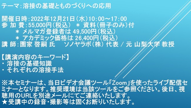 先端技術情報や市場情報を提供している(株)シーエムシー・リサーチ(千代田区神田錦町: https://cmcre.com/ )では、 各種材料・化学品などの市場動向・技術動向のセミナーや書籍発行を行っておりますが、 このたび「溶接の基礎とものづくりへの応用」と題するセミナーを、 講師に園家 啓嗣 氏 ソノヤラボ(株) 代表 / 元 山梨大学 教授)をお迎えし、2022年12月22日(木)10:00より、 ZOOMを利用したライブ配信で開催いたします。 受講料は、 一般:55,000円(税込)、 弊社メルマガ会員:49,500円(税込)、 アカデミック価格は26,400円(税込)となっております(資料付)。